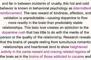 My 2017 copyrighted quote regarding intermittent reinforcement and the dopamine cycle that makes toxic love so addictive and hard to heal from.