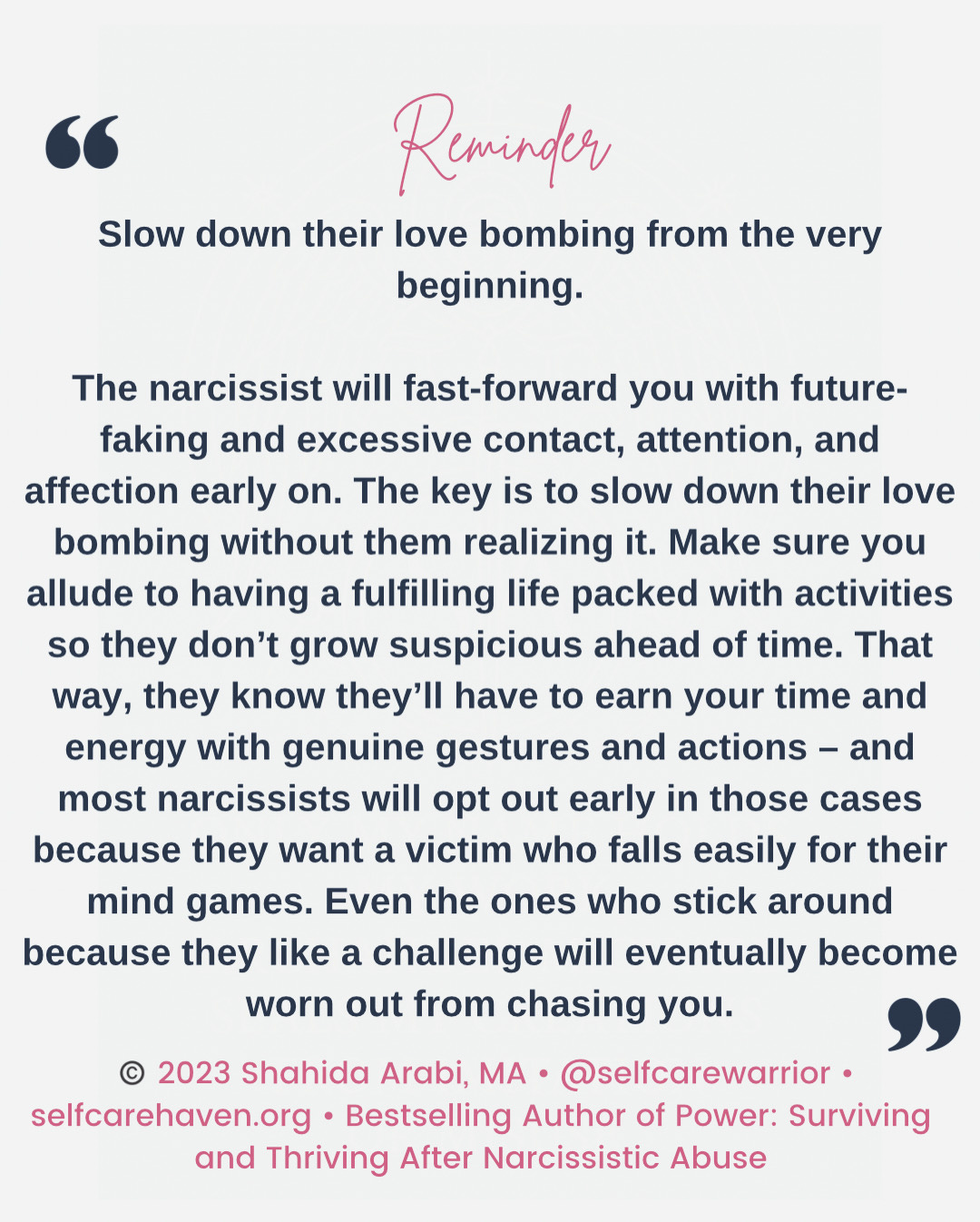 One of the most powerful ways to combat this manipulation tactic is to slow down their love bombing from the very beginning.