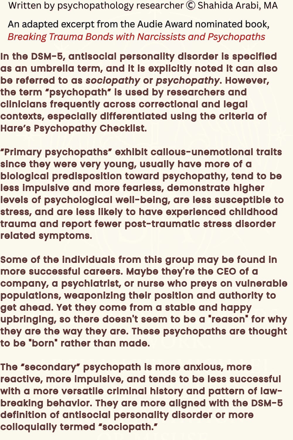 Did you know there are two subtypes of psychopathy? One that is more hot-headed and impulsive — more likely to be shaped by their environment and far more likely to violate laws and social norms in a way that causes them to be more easily caught and imprisoned? Another type that is successful, callous, fearless, and more likely to fly under the radar — a subtype that is moreso biologically predisposed to be callous and unemotional, far less susceptible to stress, more calculated and fearless, and less likely to have experienced childhood trauma — said to be born rather than “made”? Not all psychopaths are the same nor do they all have childhood trauma.